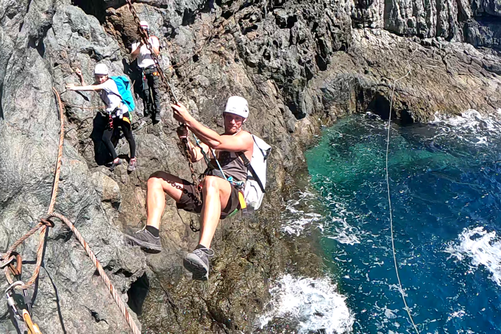 Then we will make a horizointal climbing along the cliffs in a funny via ferrata above the sea where you can see how the waves has shaped this volcanic landscape. The good thing about Via Ferratas is that even if you never have tried climbing, it’s an easy way to start. You have a safe line connected to your harness in case that you fall. In this kind of climbing experience, you don’t need to be really strong, because the most of the time, you are holding your weight with your legs, not with your hands.